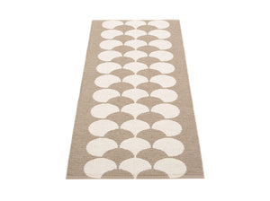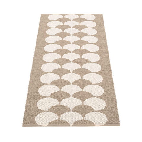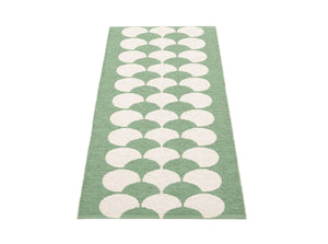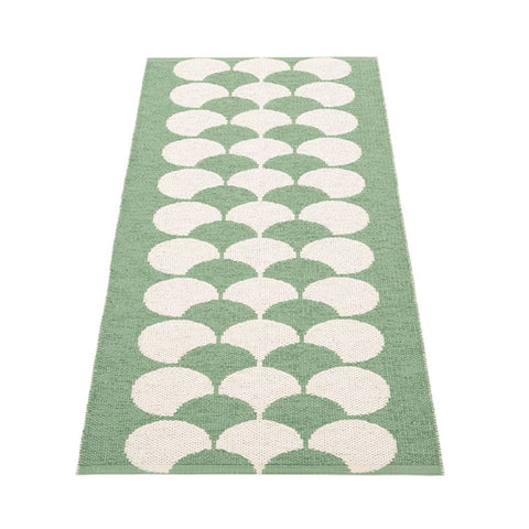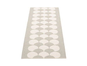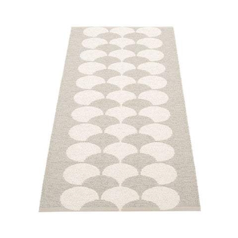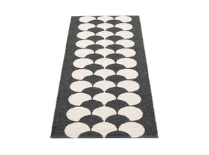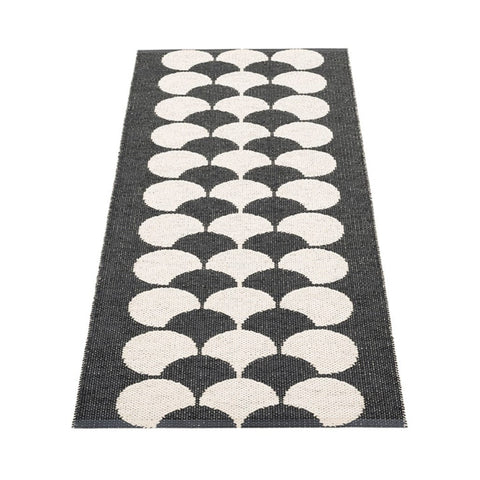 Our beautiful plastic rugs designed and manufactured in Sweden by Pappelina. Our rug is environmentally friendly due to no hazardous metals or harmful substances being used in the process. In addition, it is made of polyester warp and certified phthalate free PVC ribbon, a non toxic material. A practical rug that is reversible, soft and reinforced with welded edges. With the rug being water resistant and UV resistant it is a long lasting rug that can be used indoors or outdoors. The rug is non-absorbent and does not hold dust making it allergy free. Easy to wash, either by hand with water or a damp cloth, or machine wash.